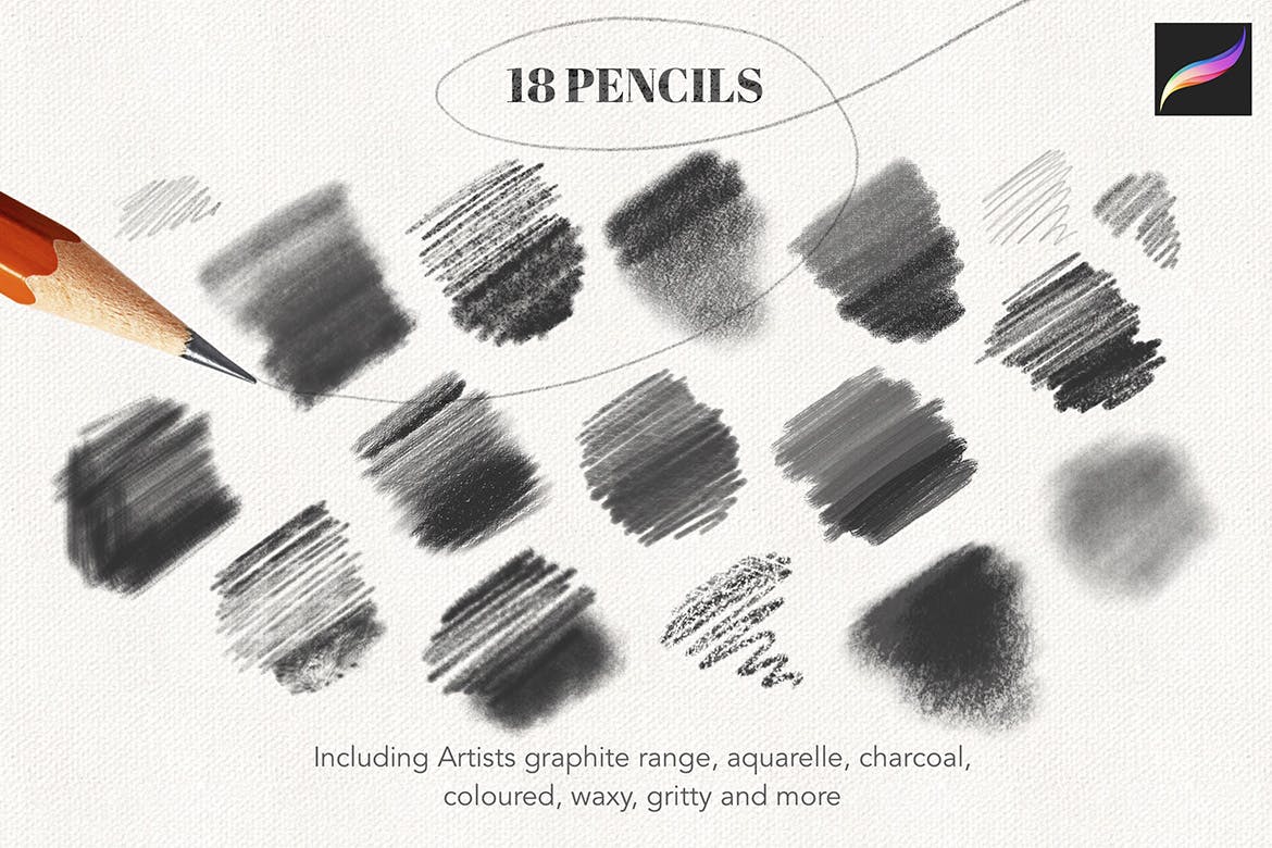 A large set of varied pencil brushes for Procreate, including 3 special pencil fill ‘cheat’ brushes, plus canvas and paper texture brushes.